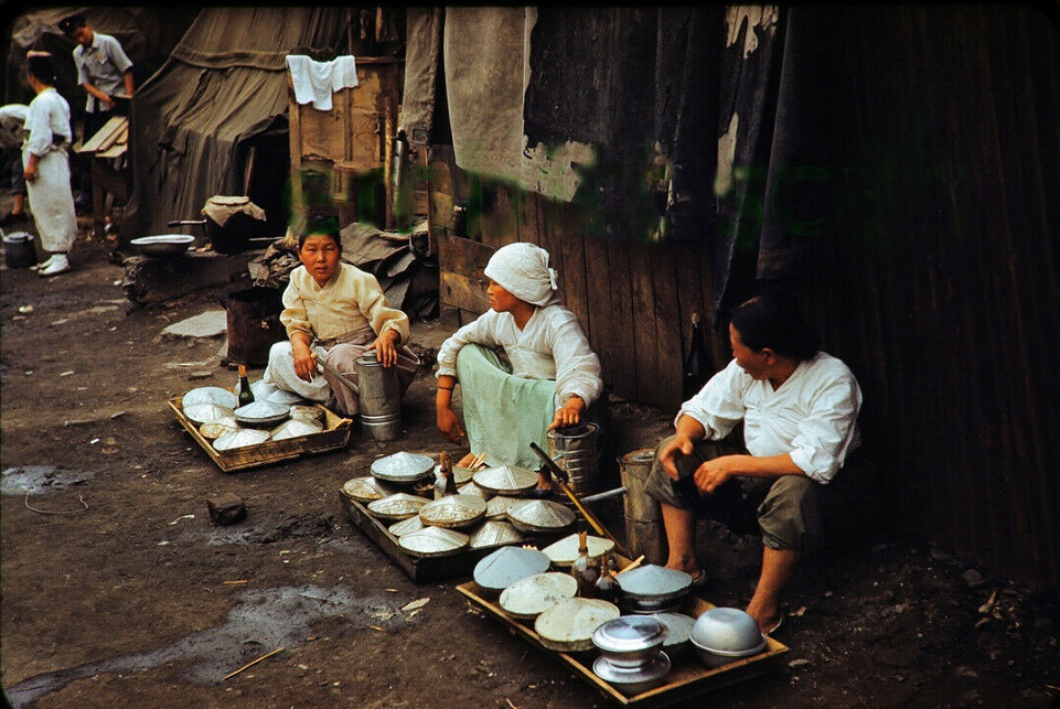 한국 6.25 전쟁 정전 협정 2년 후 서울 중구 남대문 시장 입구의 대림 상회 철물점과 노점 국수집과 노점 풀빵 장수와