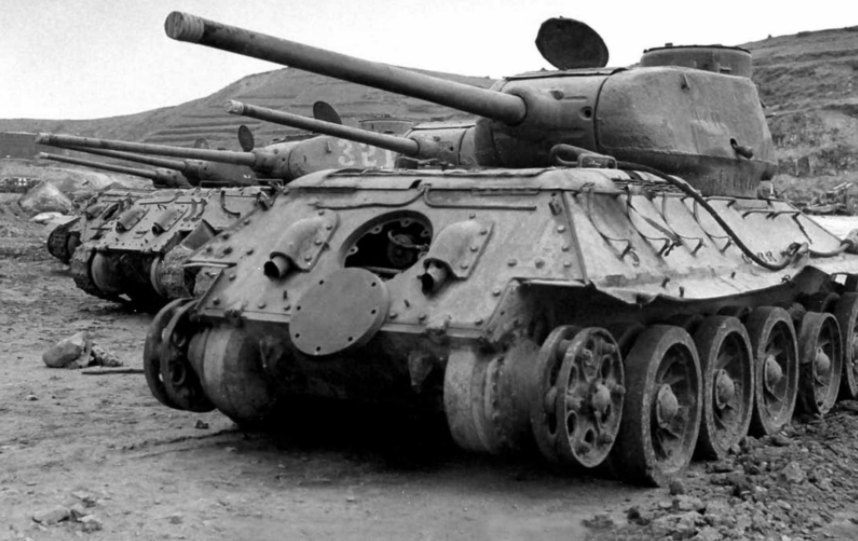 독특한 주물 포탑의 형태를 보여주는 북한 공산군의 T-34/85 전차들은 제 2차 세계대전 말기