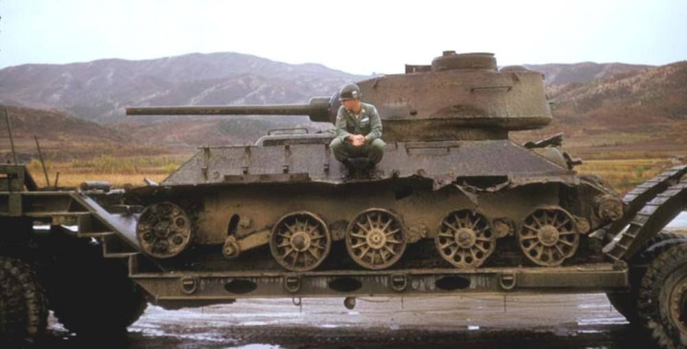 한국 6.25 전쟁 당시 미군이 노획한 후 트레일러에 적재시킨 북한 공산군의 T-34/85 전차 - 1951년